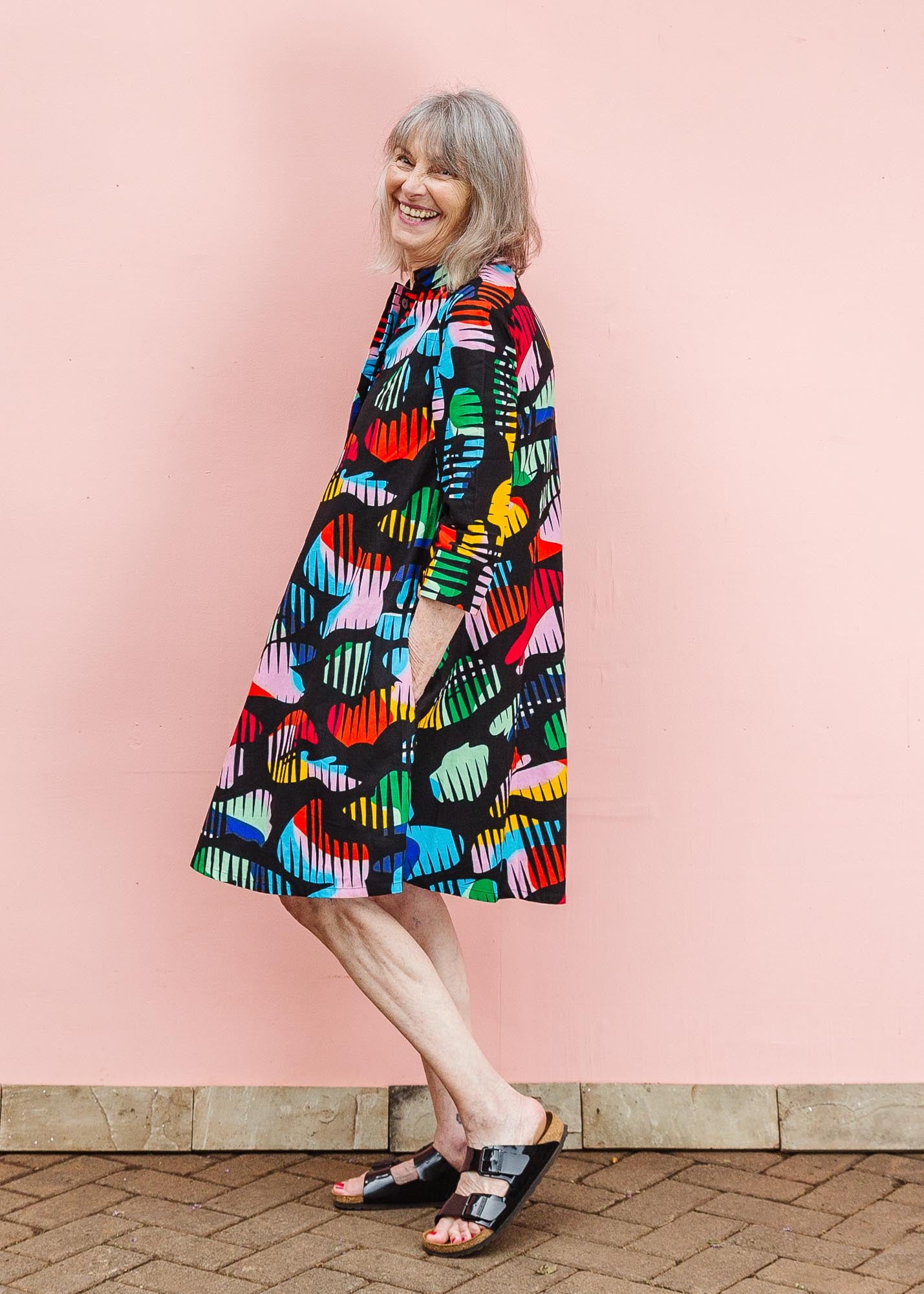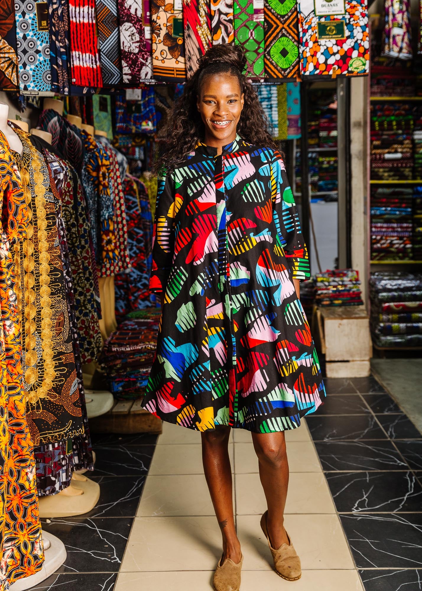 当社はダルエスサラームとナイロビの生地ベンダーの素晴らしいネットワークと協力して生地を調達しています。何年にもわたって何百ものプリントを重ねてきた結果、私たちは生地の選び方について多くのことを学びました。私たちは、知識と信頼を共有し、そうすることでこのような相互支援の経験を生み出してくれた女性たちに本当に感謝したいと思っています。当社のプロセスとベンダーについて詳しくは、こちらをご覧ください。