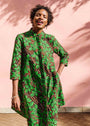 A wonderfully fun, summery dress. This dress can brighten up a cloudy day or camouflage you within summer wildflowers. I love all the greens and blues mixed in with orange, and the shapes and details are just plain awesome. This is my favorite dress for summer adventures. Light and comfy.