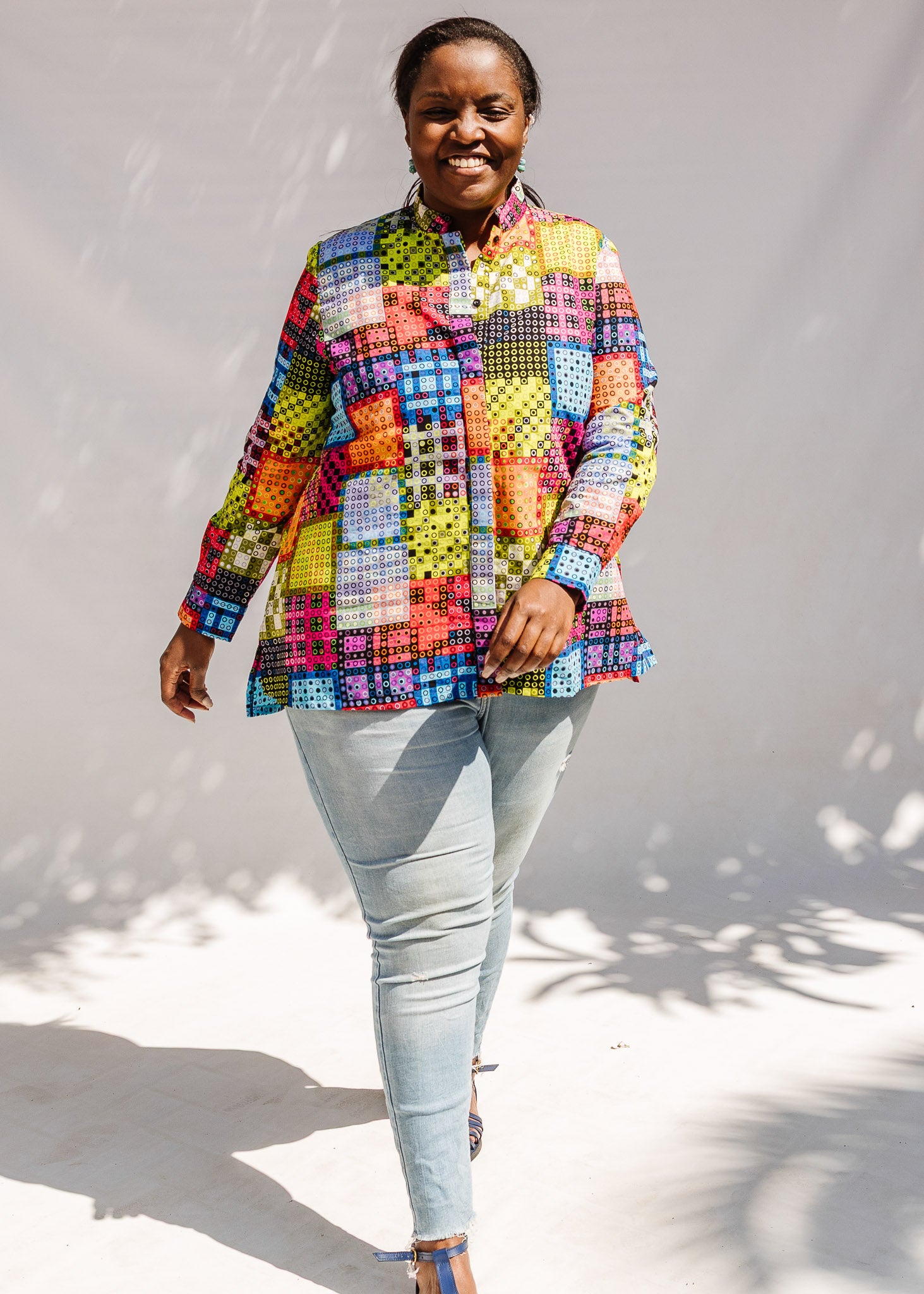 I wasn't sure if I wanted this shirt when I was shopping at your store, but once it arrived, the doubts disappeared. The colors make it such a versatile piece so that I can pair it in so many ways. With my Kazuri earrings, they are now go-to items in my closet.