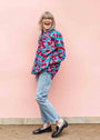 The background color is a rich navy. And the pattern is both classic and playful. It takes color as an accent—from saturated pastels (see photos) to strong jewel tones (Kelly green, red). Or just wire or black—the basics. It always looks crisp, even after a long flight (or nap)! One of my favorite shirts. The batiks are very special.